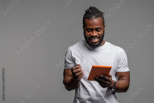 looking, watching, smiling, pleased, hand, online, television, show, video, technology, connected, connection, tablet, computer, contraption, device, cyberspace, man, male, guy, 1, person, alone, young, adult, modern, african american, photogenic, attractive, good-looking, cute, dark-haired, bearded, moustache, t-shirt, casual attire, indoor, inside, portrait