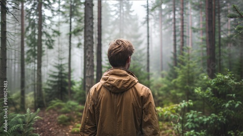 man, brown, jacket, misty, forest, serene, nature, walk, evergreen, tree, wood, outdoors, adventure, exploration, fog, mist, calmness, calm, peaceful, wilderness, travel, scenic, green, foliage, environment, relaxation, landscape, journey, solitary, backview, solitude, hiker, trail, path, lush, natural, discovery, atmosphere, timberland, person, moody, morning, scenery