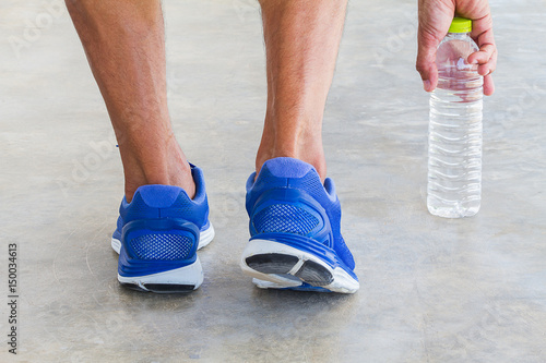 Man wearing sport shoes and picking up water bottle in gym, sport exercise concept