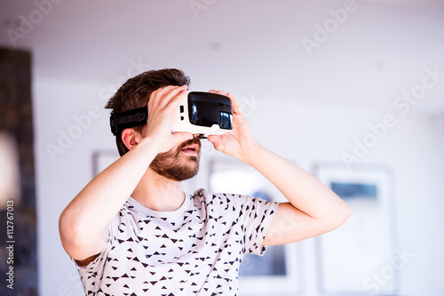 man, hipster, young, model, beard, moustache, sunlight, leisure, reality, virtual, headset, goggles, goggles, three-dimensional, entertainment, design, modern, technology, new, game, innovation, digital, video, simulation, wearable, equipment, display, 360, orientation, home, interior, indoor, sunny, casual attire, t-shirt, standing, inside, white, photogenic, living room, holding, picture