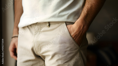 man, pant, pocket, hand, fashion, clothing, style, casual attire, beige, white, t, shirt, male, body, close, up, detail, garment, textile, cotton, clothes rack, apparel, lifestyle, comfort, design, modern, trendy, elegance, simplicity, minimalist, texture, fabric, trousers, khaki, outfit, attire, masculinity, confidence, relaxed, standing, indoor, light, shadow, contemporary, everyday, wear, menswear