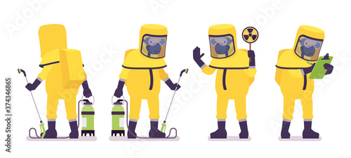 Man wearing yellow hazmat protective clothing holding sprayer, radiation sign. Worker in level A suit, coverall, chemical resistant gloves, breathing apparatus. Vector flat style cartoon illustration