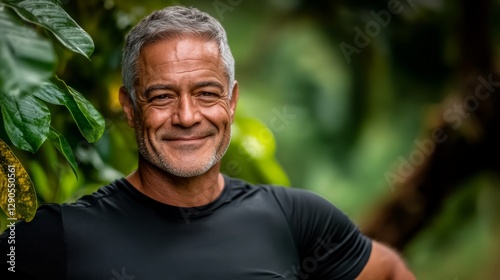 Man with a big smile on his face is standing in a lush green forest. He is wearing a black shirt and he is enjoying the natural surroundings