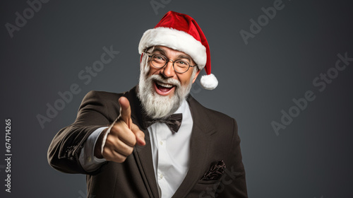 Man with a white beard, point with his finger to the side and wearing a Santa hat radiating festive joy and Christmas spirit.