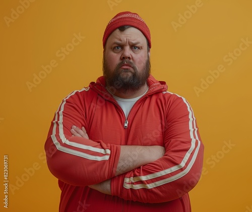 man with annoyed face expression. wearing training sport kit. against solid color background.