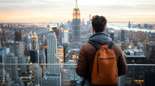 man with backpack gazes at vibrant city skyline during sunset, evoking sense of adventure and reflection. urban landscape features towering skyscrapers and warm, glowing horizon