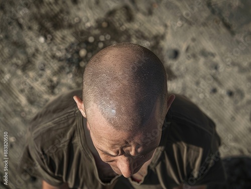 man, bald, head, looking, down, person, sharpened, attention, concentration, close, up, study, examine, investigate, detective, solving, problem, puzzle, mystery