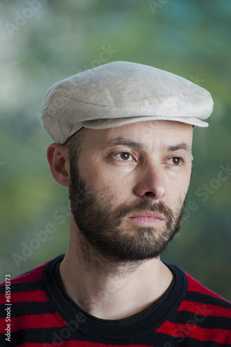 menfolk, barbed, face, adult, young, portrait, man, seriousness, hat, people, grey, foreground, thinking, front view, studio, happy, security, attitude, colours, smug, contemplation, photo, satisfaction, stare, pensive, individuality, horizontal, manhood, white, european