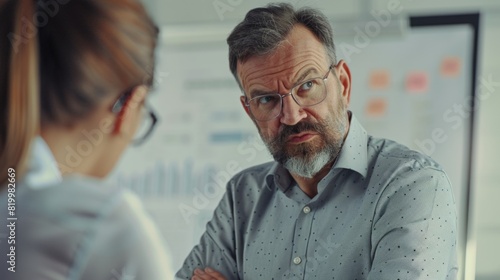 man, woman, professional, business, conversation, meeting, beard, goggles, serious, concerned, discussion, expression, office, focused, attire, shirt, arm, whiteboard, presentation, work, crossed, listening, dot, background, polka, environment, colleague, attentive, leaning, interaction