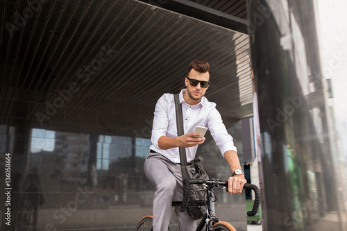 happy, man, city, riding, bicycle, smartphone, bag, business, freelance, freelancer, shoulder bag, street, summer, businessman, corporate, office worker, outdoors, young, people, person, lifestyle, male, concept, urban, fashion, style, metrosexual, bike, biking, cycle, vehicle, sunglasses, shades, contraption, app, application, technology, mobile phone, mobile, mobile phone, phone, communication, networking, connection, cyberspace, online, browsing, texting