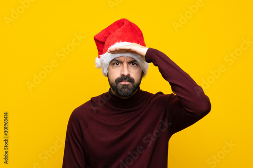 Man with christmas hat over isolated yellow background looking far away with hand to look something