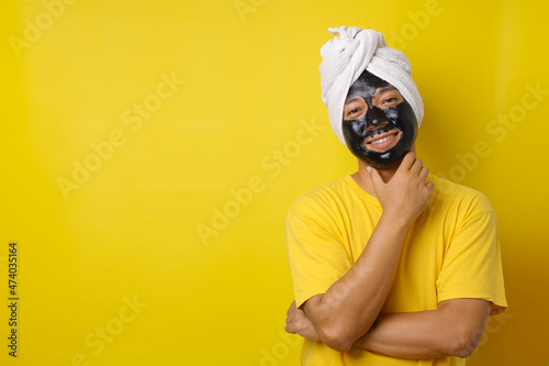 adult, asian, attractive, background, beauty, care, caucasian, cheerful, clean, confident, cosmetic, expression, face, facial, fresh, gesture, grooming, guy, habit, photogenic, happy, health, healthy, indonesian, isolated, lifestyle, male, masculine, mask, model, morning, people, person, portrait, positive, procedure, routine, skin, skincare, smile, studio, style, towel, treatment, yellow, young