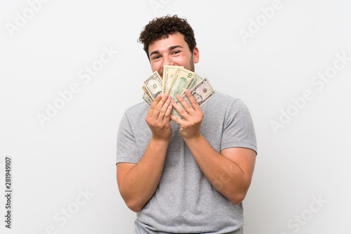 man, man, people, person, male, guy, casual attire, young, adult, hispanic, caucasian, curly, hair, background, wall, isolated, money, cash, business, dollar, currency, paper, bill, banking, success, savings, bank, salary, abundance