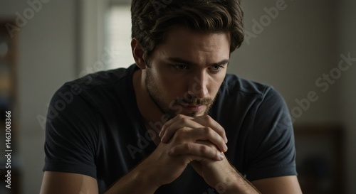 man, dark hair, moustache, thoughtful, expression, sitting, indoor, portrait, male, adult, serious, pensive, contemplative, looking down, t-shirt, casual attire, caucasian, facial hair, photogenic, model, studio, closeup, person, human, lifestyle, mood, emotion, melancholy, sorrowful, gloom, brooding, worried, concerned, anxious, stress, despair, upset, unhappy, grief