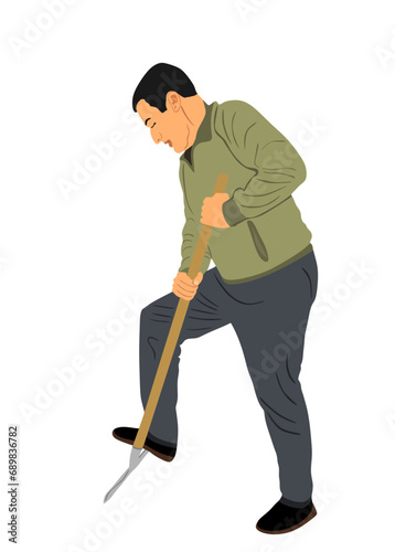 Man with shovel working in garden vector illustration isolated. Construction worker with spade. Gardener digging earth. Farmer with shovel. Digger worker mining ground with tool. Manual industry.