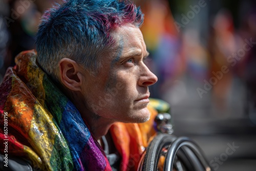 man, person, portrait, profile, head shot, rainbow flag, pride, parade, celebration, event, community, diversity, inclusion, equality, right, freedom, acceptance, support, solidarity, thoughtful, contemplative, looking, outdoors, daylight, vibrant, bright, expressive, unique, individuality, identity, disability, wheelchair, mobility, accessibility, human, adult, activism, authentic, representation