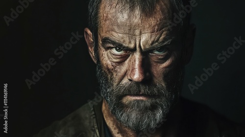 Man with weathered face, intense stare, rugged and mysterious, strong character, black background, dramatic lighting