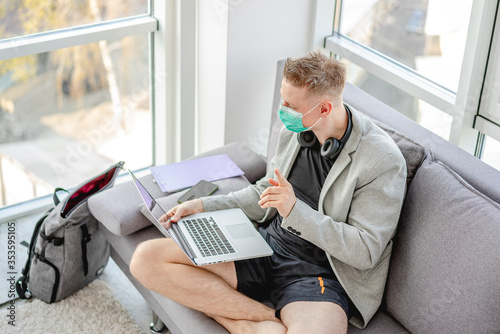 work, telework, telecommuting, office, men at work, laptop, business, man, businessman, computer, working, home, indoor, freelancer, mask, photogenic, adult, freelance, attractive, remote, virus, disease, infection, quarantine, isolation, prevention, male, distant, protective, face, corona, epidemic, pandemic, protection, flue, flu, health, sofa, health care, apartment, earphones
