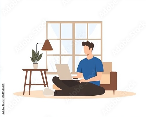 man, working, home, laptop, computer, remote, work, office, desk, chair, sitting, window, light, lamp, couch, sofa, comfortable, relaxed, sharpened, concentration, cyberspace, technology, freelancer, business, entrepreneur, casual attire, modern, interior, home office, productivity, online