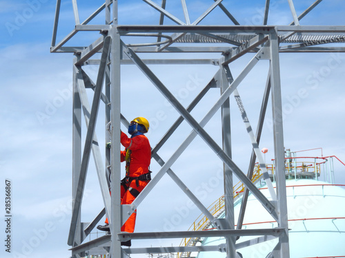 Man Working on the Working at height. Professional industrial climber in helmet and uniform works at height. Risky extreme job. Industrial climbing at construction site.