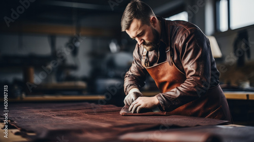 Man working with leather using crafting DIY tools