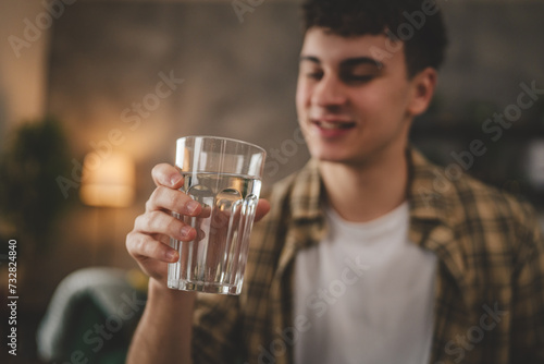 man, glasses, water, home, drink, hold, portrait, indoor, looking, male, cheerful, smiling, young, modern, apartment, confidence, one person, casual clothes, confident, copy space, caucasian, real people, comfortable, morning, relaxation, carefree, day, curly hair, domestic life, joy, house, 20s, positive, concept, happy, smile, healthy, holding, health, lifestyle, refreshment, fresh, person, happiness, freshness, casual attire, drinking, indoor