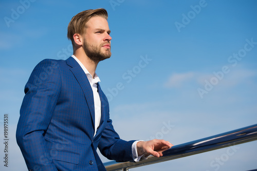 Manager on blue sky. Bearded man in business suit outdoor. Businessman on sunny day. Business fashion, style and dress code. Career, success and future concept, copy space