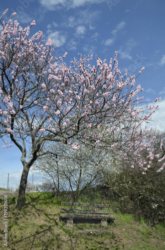 almond blossom, almond tree, spring, spring, countryside, nature, bench, break, linger, enjoyment, idyl, sunshine