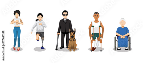 manga, style, prosthetic, leg, bandage, blind, sunglasses, dog, wheelchair, patient, athlete, old, cripple, black, german shepherd dog, run, deaf, hearing, language, hand, sense, communication, ear, signs, handicap, african, american, disability, disabled, health care, various, cartoon, vector, illustration