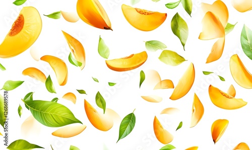Mango pieces flying in the air, mango slices and cubes, mango leaves on a white background