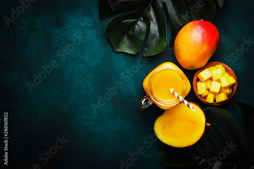 Mango smoothie in glass jar with fresh fruit on blue background, copy space, top view