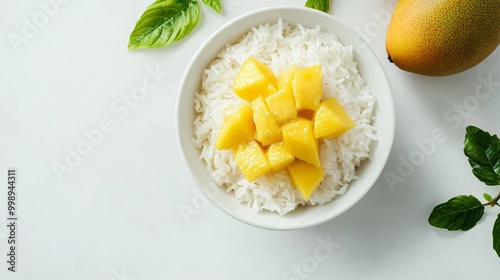 Mango sticky rice with coconut cream, placed on a clean white minimalist background