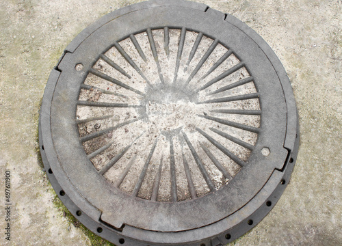 Manhole cover close up picture. Close-up of old metal sewer manhole on a concrete base