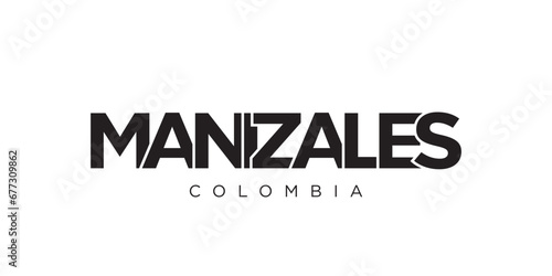 Manizales in the Colombia emblem. The design features a geometric style, vector illustration with bold typography in a modern font. The graphic slogan lettering.