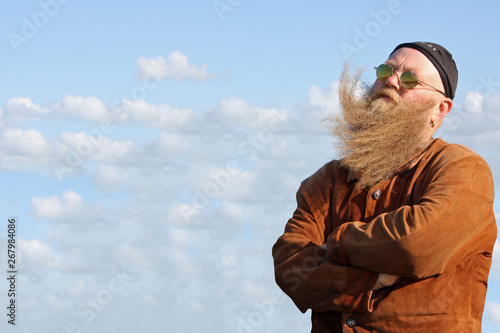 man, beard, long, hair, bandana, clothes, blond, wind, storm, dishevelled, coast, levee, grass, meadow, smile, face, eye, mouth, nose, brow, brew, spectacle, sunglasses, coat, man, ear, smile, fun, fun, well-being, vacation, feeling, laid back, portrait, young, aged, person, summer, sun, look, heaven, nature, casual, senior, lifestyle