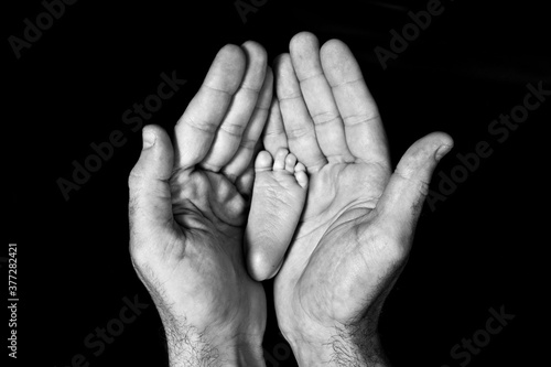 mano de bebé sosteniendo mano de adulto en blanco y negro