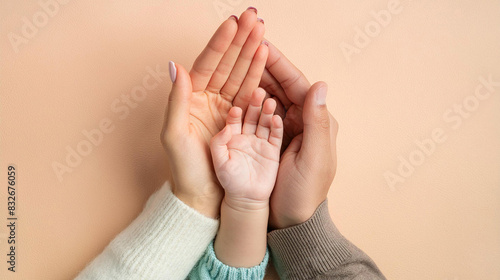 Mano de una pareja Jioven, sosteniendo la mano de un bebé, fondo en tono pastel, concepto de familia.
