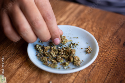 manos seleccionando marihuana (Cannabis) para armar un blunt. Concepto de medicina natural.