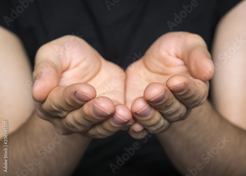 Man`s empty hands with palms up on the dark background.