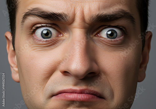 Man's Extreme Disgust: Wide Eyes, Furrowed Brow, and Pursed Lips Against Gray.