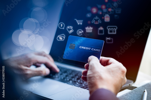 Man's hand holding credit card while using laptop online with shopping illustration icon