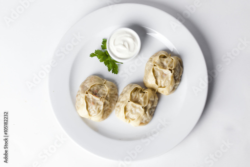 manti dumplings ravioli great big huge with sour cream and parsley on a plate menu for the cafe restaurant isolated white background