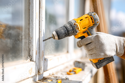 drill, window, renovation, construction, hand-held, tool, glove, repair, home, wood, hand, carpenter, workshop, fix, safety, craft, precision, hardware, indoor, carpenter's shop, drilling, hand tool, construction site, home improvement, woodwork, craftsman, project, craftsmanship, casing, handyman, framework