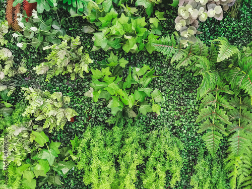 Many beautiful artificial green plant decoration on the wall and make it look fresh and beautiful. Decorate the garden with fake plants on the wall of the house for nature background. Selective focus.