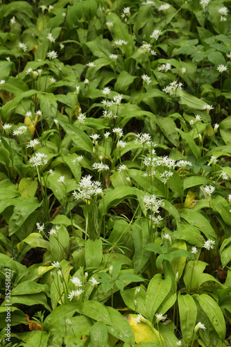 wild garlic, bloom, meadow, glade, allium, blossom, flower, leaf, fresh, green, spring, flora, plant, vertical, closeup, leek, detail, blooming, nature, sunny, dew, springtime, health, vegetarian, seasonal, food, salad, herb, spicey, vegetation, background, botany, environment, organic, flier, booklet, postcard, print, wood, texture