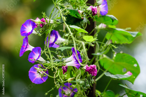 Many delicate vivid blue and purple flowers of morning glory plant in a a garden in a sunny summer garden, outdoor floral background photographed with soft focus.