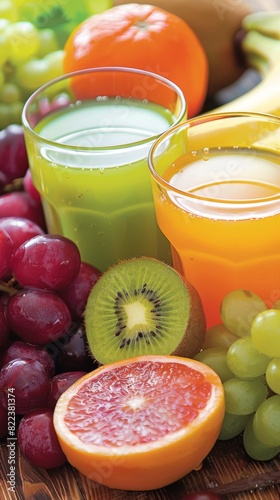 Many different fruits and juices on the table, sugary fruit juice, drink background