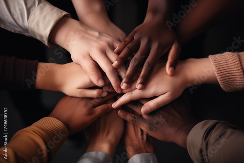 Many hands from diverse people joining together in circle, people putting hands together as symbol of unity. Team Concept, Top View