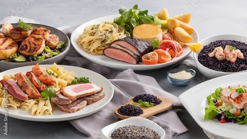 Many kinds of food on the table, ribeye steak, turkey with black rice. Pasta with seafood, club sandwich