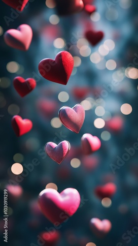 heart, love, valentine, day, romance, romantic, background, blue, pink, red, floating, bokeh, light, soft, illustration, three-dimensional, render, digital, art, design, decoration, greeting, card, invitation, celebration, february, concept, passion, emotion, feeling